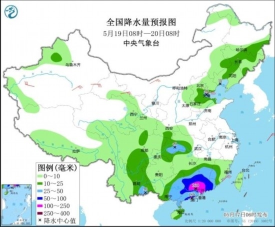 5月19日08時(shí)至20日08時(shí),天津、湖北南部、云南東南部、江南南部、華南大部等地部分地區(qū)有大到暴雨,其中,廣東中西部部分地區(qū)及粵港澳大灣區(qū)有大暴雨,局地特大暴雨(250~260毫米)。內(nèi)蒙古西北部、新疆南部、甘肅河西等地部分地區(qū)有4~6級(jí)風(fēng)(見圖3)。