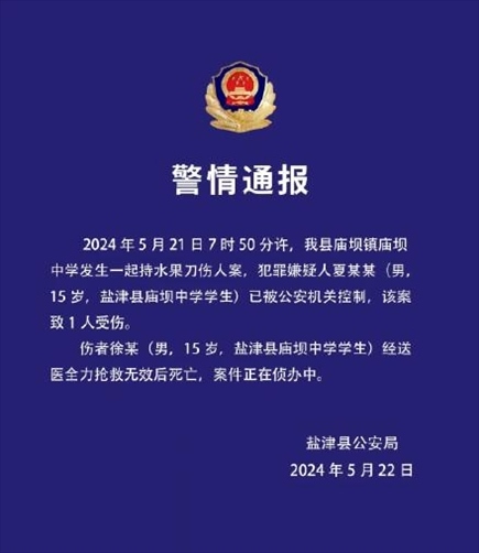 ·云南鹽津公安通報(bào)一中學(xué)發(fā)生持水果刀傷人案:嫌疑人已被控制,一人搶救無(wú)效死亡。