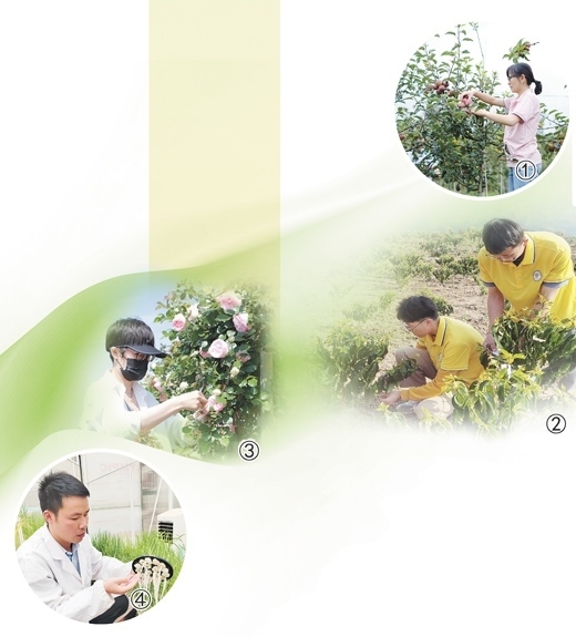 圖①:劉丹丹在調(diào)查蘋果病害情況。 圖②:咖啡團(tuán)隊(duì)的學(xué)生們在咖啡田地里進(jìn)行花芽分化調(diào)查。 圖③:周寧寧在進(jìn)行月季雜交授粉。 圖④:雷貴杰在觀察水稻根系的生長狀況。以上圖片均為受訪者提供