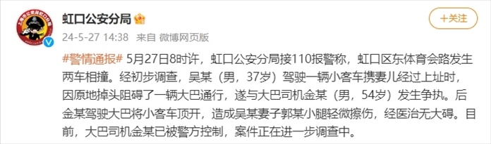 央視網(wǎng)消息:上海市公安局虹口分局發(fā)布警情通報,5月27日8時許,虹口公安分局接110報警稱,虹口區(qū)東體育會路發(fā)生兩車相撞。經(jīng)初步調(diào)查,吳某(男,37歲)駕駛一輛小客車攜妻兒經(jīng)過上址時,因原地掉頭阻礙了一輛大巴通行,遂與大巴司機金某(男,54歲)發(fā)生爭執(zhí)。后金某駕駛大巴將小客車頂開,造成吳某妻子郭某小腿輕微擦傷,經(jīng)醫(yī)治無大礙。目前,大巴司機金某已被警方控制,案件正在進一步調(diào)查中。
