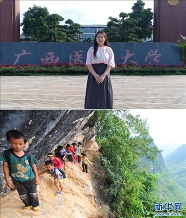 拼版照片:上圖為2023年5月27日,22歲的蒙秋艷站在廣西醫(yī)科大學校門口。