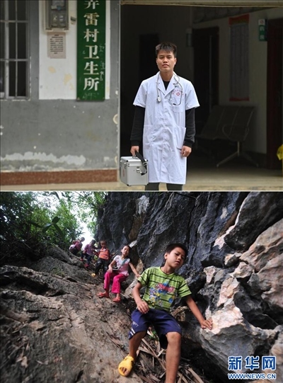 下圖為2012年9月5日,10歲的蒙富松(右一)爬懸崖去學校讀書。新華社記者 黃孝邦 攝