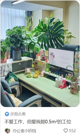 “按個人喜好裝修的工位可以讓年輕人在這一方小天地里可以獲得短暫的歸屬感與安全感,將目之所及之處都變成自己想要的樣子,令他們在客觀條件有限的情況下盡可能讓自己感到舒適,也更容易從工作中感到幸福。”于光瑞分析說。