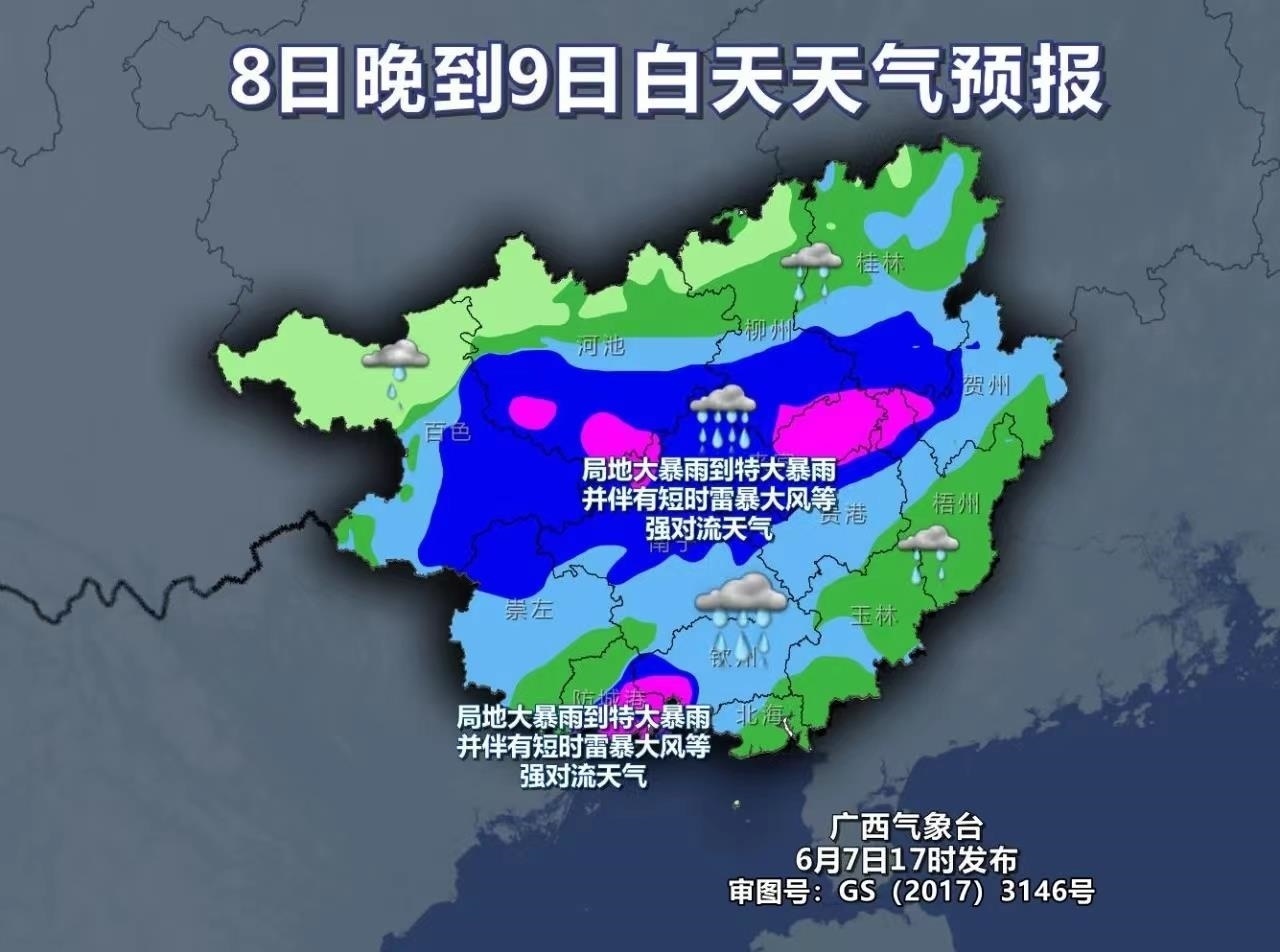 8日晚上到9日白天,雨勢升級,并進(jìn)入此輪降雨的最強(qiáng)階段,強(qiáng)降雨的范圍也將進(jìn)一步擴(kuò)大,廣西全區(qū)有大雨到暴雨,局地有大暴雨到特大暴雨,并伴有短時(shí)雷暴大風(fēng)等強(qiáng)對流天氣。