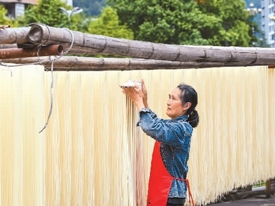 在重慶市酉陽(yáng)土家族苗族自治縣桃花源街道河濱掛面加工作坊,村民正在晾曬傳統(tǒng)手工掛面。邱洪斌攝(人民視覺)