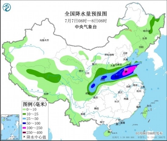 全國(guó)降水量預(yù)報(bào)圖(7月7日08時(shí)-8日08時(shí)) 圖源:中央氣象臺(tái)網(wǎng)站