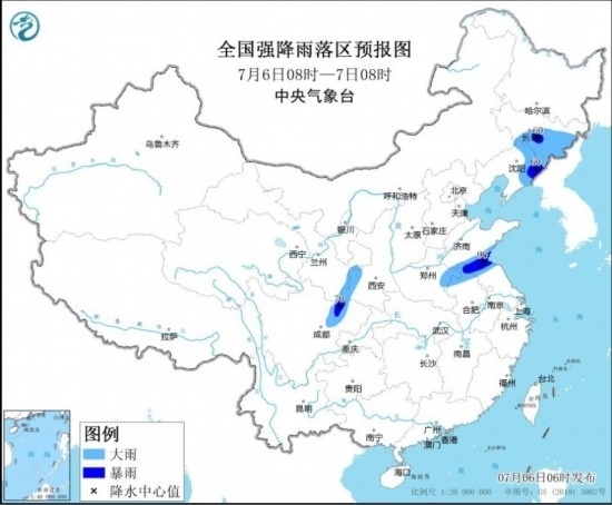 預(yù)計(jì),7月6日08時(shí)至7日08時(shí),吉林中東部、遼寧東部、陜西南部、山東南部、河南東部、安徽北部、江蘇北部、四川盆地西北部等地部分地區(qū)有大雨,其中,吉林中東部、遼寧東部、山東南部、江蘇北部、四川盆地西北部等地部分地區(qū)有暴雨(50~90毫米)。上述部分地區(qū)伴有短時(shí)強(qiáng)降水(最大小時(shí)降雨量20~50毫米,局地可超過(guò)60毫米);吉林東部、遼寧東部、山東南部、河南東部、安徽北部、江蘇北部等地的部分地區(qū)將有8-10級(jí)雷暴大風(fēng)或冰雹天氣。中央氣象臺(tái)7月6日06時(shí)發(fā)布暴雨藍(lán)色預(yù)警和強(qiáng)對(duì)流天氣藍(lán)色預(yù)警。
