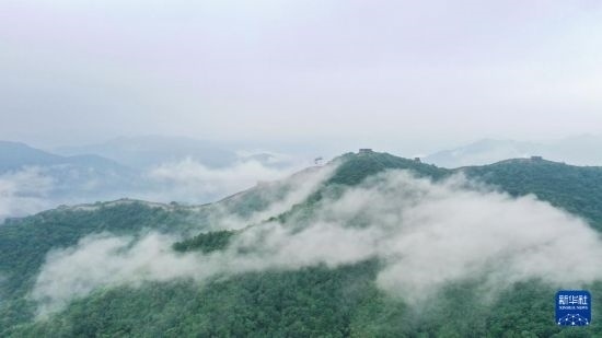 云霧繚繞的慕田峪長城(8月3日攝,無人機(jī)照片)。