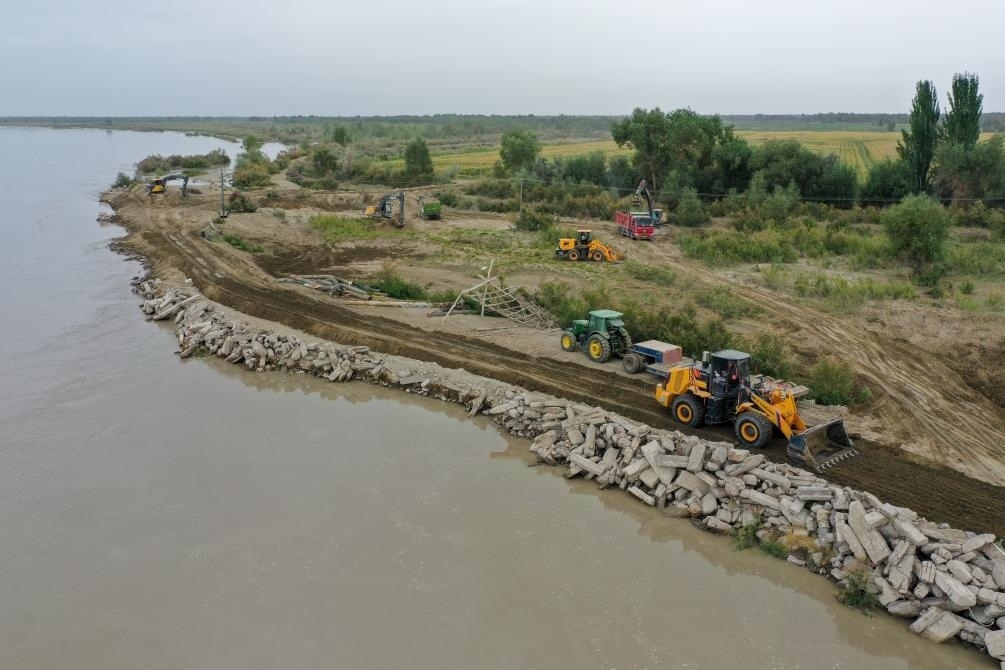 2024年8月3日,在新疆阿克蘇地區(qū)沙雅縣蓋孜庫(kù)木鄉(xiāng)吐央村,搶險(xiǎn)人員駕駛大型機(jī)械進(jìn)行堤壩加固(無(wú)人機(jī)照片)。新華社記者 丁磊 攝