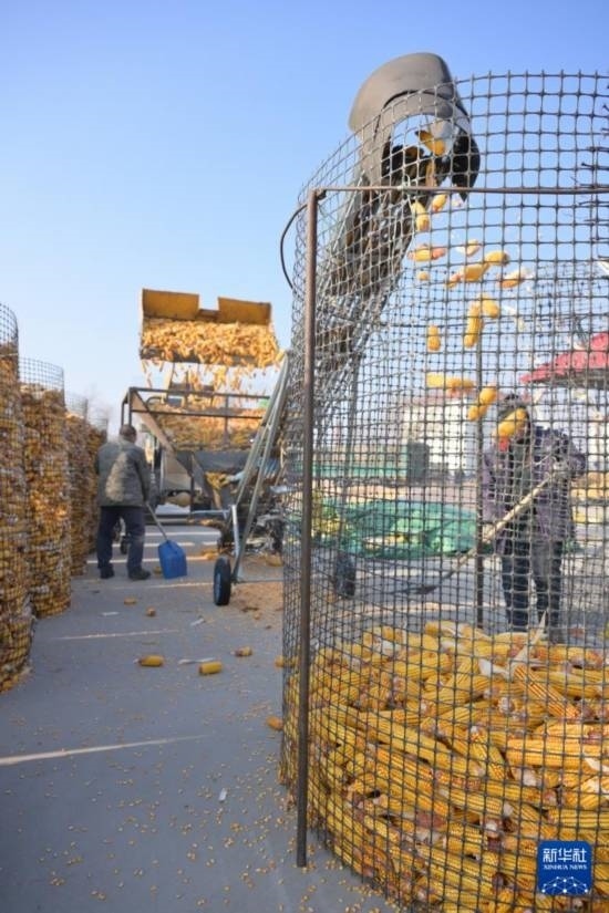 11月13日,在黑龍江省肇東市一處秋糧晾曬場(chǎng),海城雙麗現(xiàn)代農(nóng)機(jī)專(zhuān)業(yè)合作社的農(nóng)民在堆放玉米。