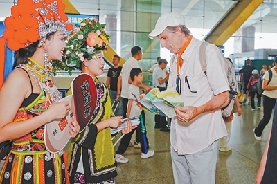 在云南昆明長水國際機(jī)場舉行的南華野生菌推介活動上,工作人員向外國友人介紹野生菌產(chǎn)品。南華縣委宣傳部供圖