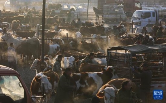 12月6日,人們在甘肅省定西市安定區(qū)李家堡鎮(zhèn)的牲畜交易市場交易。