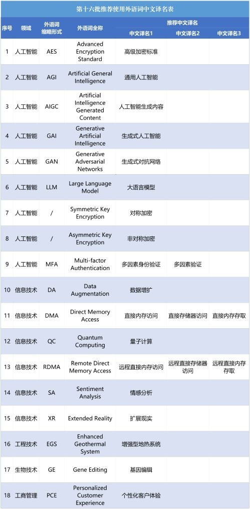 記者12月10日從教育部獲悉,近日,外語中文譯寫規(guī)范部際聯(lián)席會議專家委員會審議通過第十六批18組推薦使用外語詞中文譯名。本次擬推薦使用的外語詞中文譯名,均為與人工智能、信息技術(shù)等相關(guān)的詞條。
