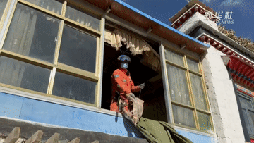 在定日縣措果鄉(xiāng)野江村,消防員在活動(dòng)板房上安置國旗(1月13日攝)。(新華社記者 丁增尼達(dá) 攝)
