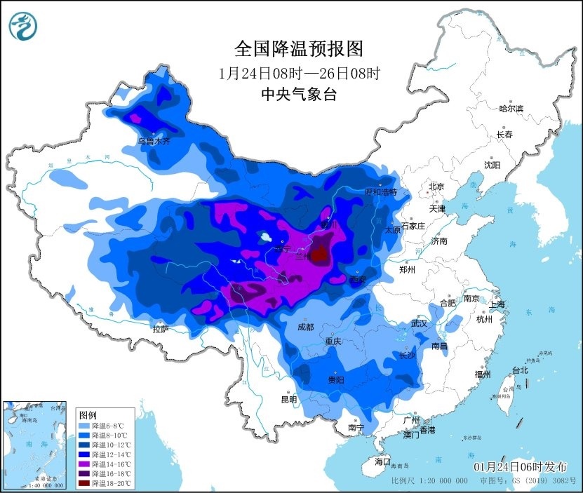 今明兩天,寒潮將主要影響我國西部地區(qū),新疆北部、西藏中北部、青海、甘肅、寧夏、陜西、山西西部、川西高原北部等地將先后降溫8~10℃,其中,新疆北部、甘肅西部和南部、寧夏大部、陜西南部、川西高原北部等地部分地區(qū)降溫可達(dá)12℃以上 。1月26日至27日,冷空氣繼續(xù)東移南下,華北及其以南大部地區(qū)將有明顯降溫。