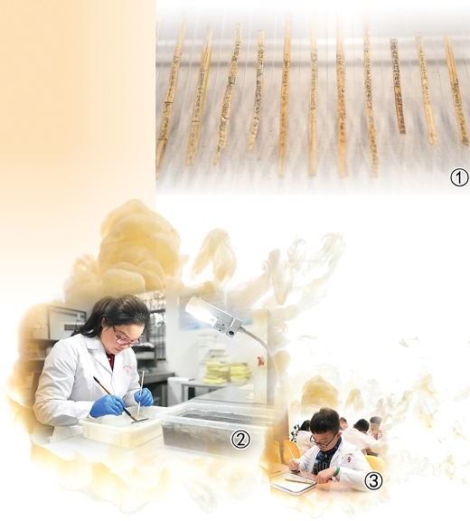 “要經(jīng)過一系列的保護(hù)流程,才能讓枚枚簡(jiǎn)牘從糊滿泥土、通體發(fā)黑、糟朽脆弱的狀態(tài)恢復(fù)到具有足夠強(qiáng)度支撐、文字墨跡可辨別釋讀的程度?!苯鹌秸f。