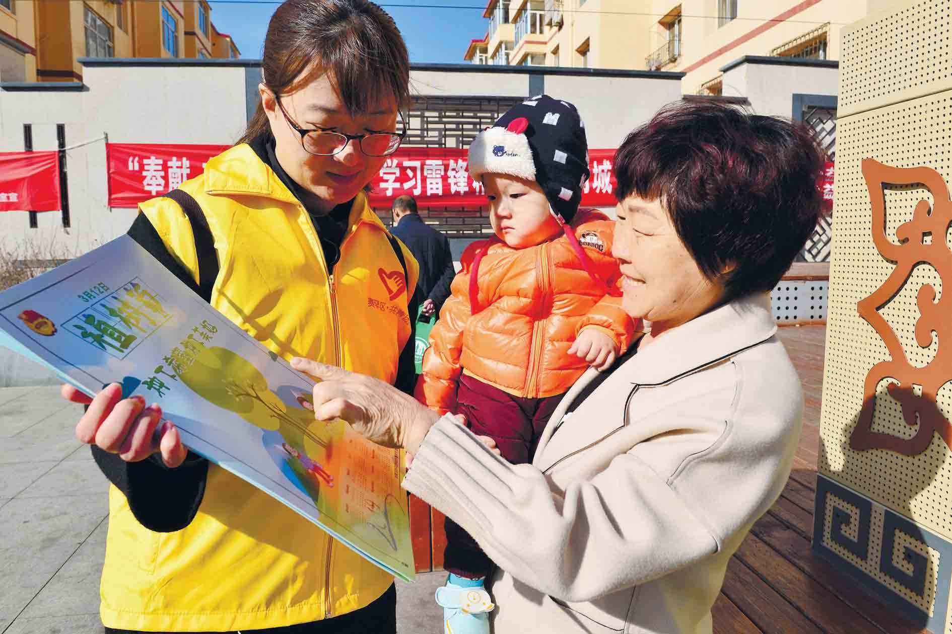 3月12日,志愿者在呼和浩特市賽罕區(qū)金地文化廣場上為市民發(fā)放宣傳資料。當(dāng)日,賽罕區(qū)綠化委員會(huì)辦公室舉辦了“3·12植樹節(jié)”宣傳活動(dòng)。據(jù)悉,2018年賽罕區(qū)完成植樹958萬株(叢),人均公園綠地面積19.1平方米,建成區(qū)綠化覆蓋率42.3%。(內(nèi)蒙古日報(bào)社融媒體記者 安寅東)