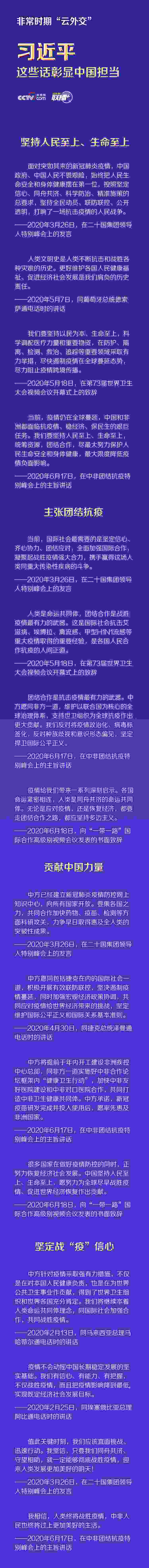 截至目前,習近平主席已經(jīng)同數(shù)十位外國領導人及國際組織負責人通話或見面,出席二十國集團領導人應對新冠肺炎特別峰會,在第73屆世界衛(wèi)生大會視頻會議開幕式上致辭,主持中非團結(jié)抗疫特別峰會并發(fā)表主旨講話等,開啟了以電話、書信、視頻為主渠道的“云外交”模式。