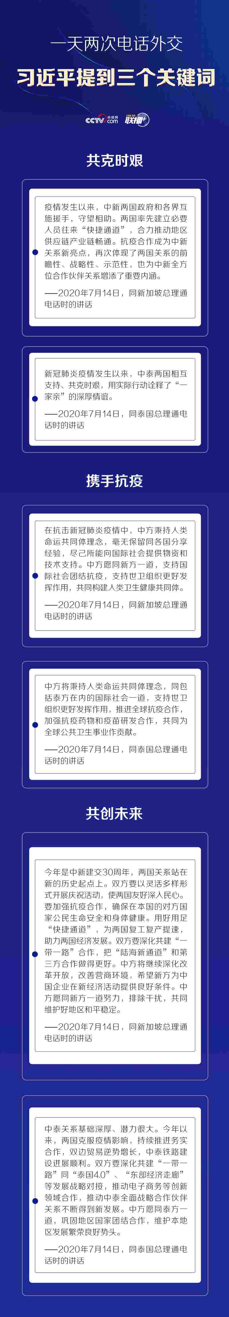 聯(lián)播+當(dāng)前,新冠肺炎疫情仍在全球蔓延,多國面臨外防輸入、內(nèi)防反彈的壓力。7月14日,習(xí)近平主席分別同新加坡總理李顯龍和泰國總理巴育通電話。