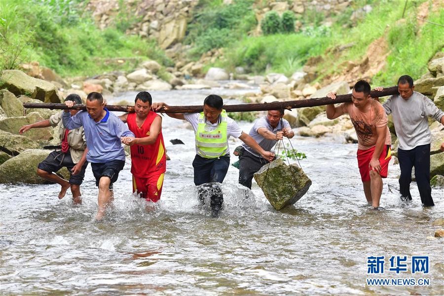 在位于黔桂交界大苗山深處的烏英苗寨,駐村第一書記韋桂華(右四)、黨員梁成兵(右三)、梁志新(左二)帶領村民維修河堤(2019年6月30日攝)。新華社記者黃孝邦攝