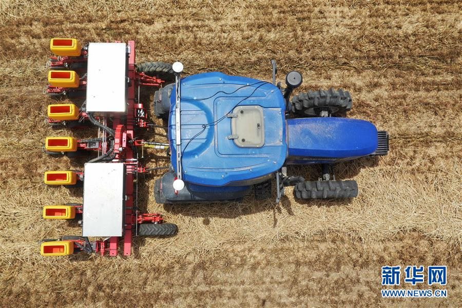 在河南省鄧州市小楊營鎮(zhèn)安眾村,加裝有北斗導航系統(tǒng)的拖拉機在無人駕駛狀態(tài)下播種(2020年5月26日攝,無人機照片)。新華社記者馮大鵬攝