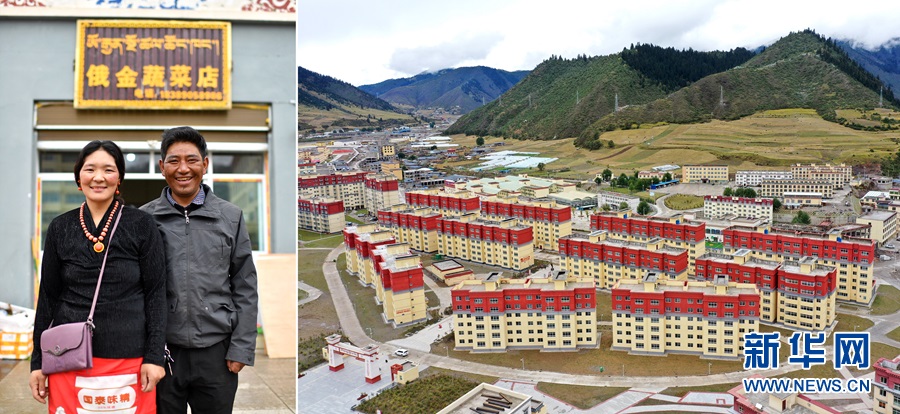 2020年9月22日拍攝的拼版照片:左圖為西藏自治區(qū)昌都市類烏齊縣長毛嶺鄉(xiāng)達雄村村民俄金(右)和妻子阿丁在安置點俄金蔬菜店前;右圖為類烏齊縣桑多扶貧開發(fā)區(qū)易地扶貧搬遷安置點一角(無人機照片)。新華社記者詹彥攝
