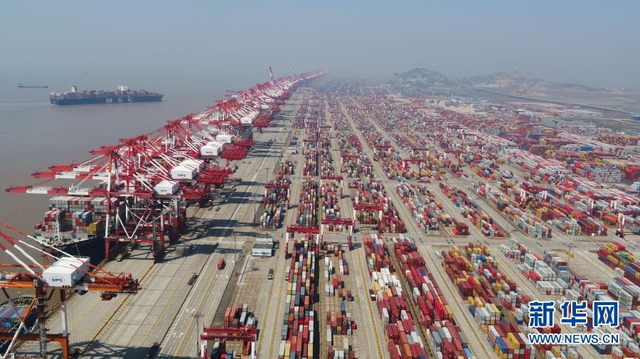 這是3月18日拍攝的上海洋山港集裝箱碼頭(無人機照片)。新華社記者 丁汀 攝