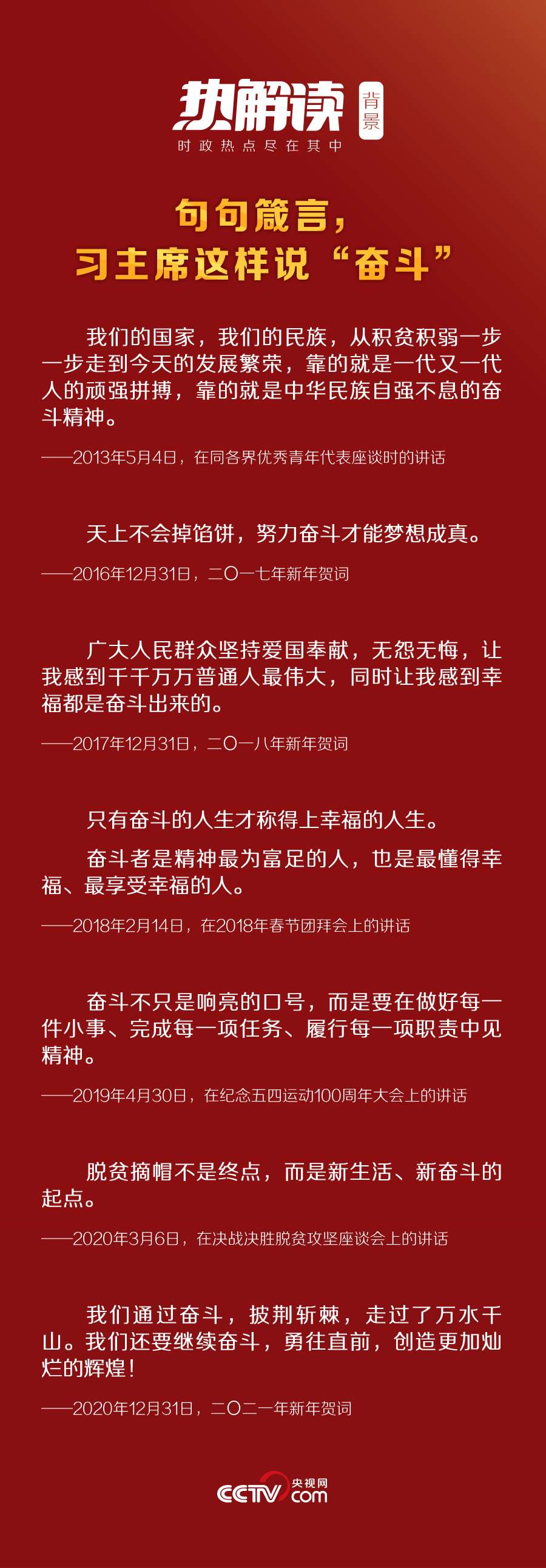 2020年,“十三五”圓滿(mǎn)收官,“十四五”全面擘畫(huà);2021年,既是“十四五”開(kāi)局之年,又是“兩個(gè)一百年”的歷史交匯點(diǎn),全面建設(shè)社會(huì)主義現(xiàn)代化國(guó)家新征程即將開(kāi)啟。在這個(gè)關(guān)鍵節(jié)點(diǎn)再次強(qiáng)調(diào)“奮斗”,習(xí)近平主席意蘊(yùn)深遠(yuǎn)。