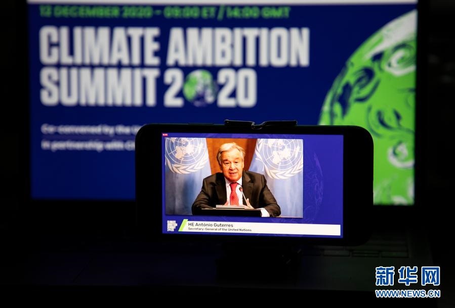 這是2020年12月12日在美國紐約拍攝的聯(lián)合國秘書長古特雷斯在氣候雄心峰會上通過視頻發(fā)表講話的屏幕畫面。氣候雄心峰會由聯(lián)合國及有關(guān)國家倡議舉辦,旨在紀念《巴黎協(xié)定》達成五周年,進一步動員國際社會強化氣候行動,推進多邊進程。新華社記者 王迎 攝