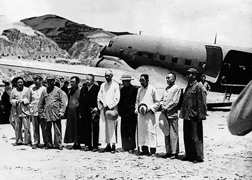 1945年7月,國民參政會參政員黃炎培等六人飛抵延安,同中國共產黨商談兩黨團結、共建國內和平問題,毛澤東等親臨機場歡迎。圖:新華社