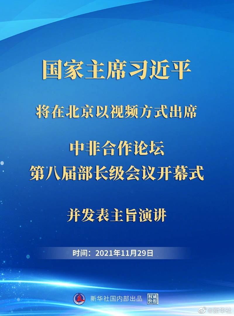 新華社北京11月26日電 外交部發(fā)言人華春瑩26日宣布:國(guó)家主席習(xí)近平將于11月29日在北京以視頻方式出席中非合作論壇第八屆部長(zhǎng)級(jí)會(huì)議開(kāi)幕式并發(fā)表主旨演講。