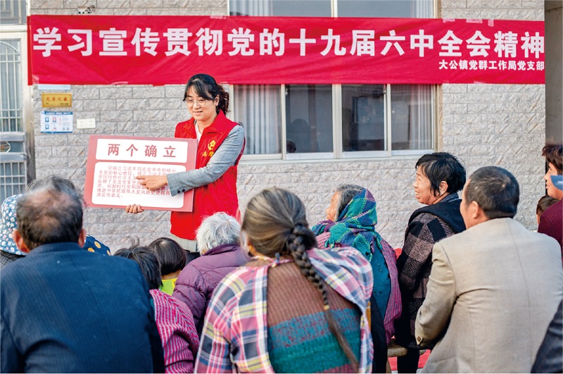 2021年11月18日,江蘇省南通市海安市大公鎮(zhèn)黨員志愿者在常河村12組向村民宣傳黨的十九屆六中全會(huì)精神,用老百姓聽得懂、能領(lǐng)會(huì)的方式將全會(huì)精神傳達(dá)到基層。人民視覺翟慧勇/攝