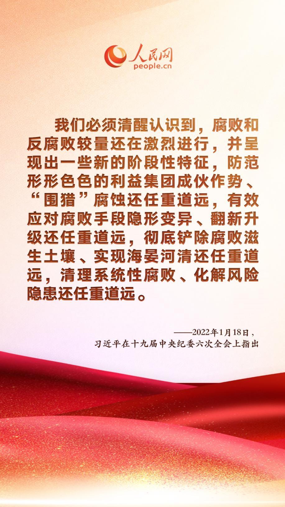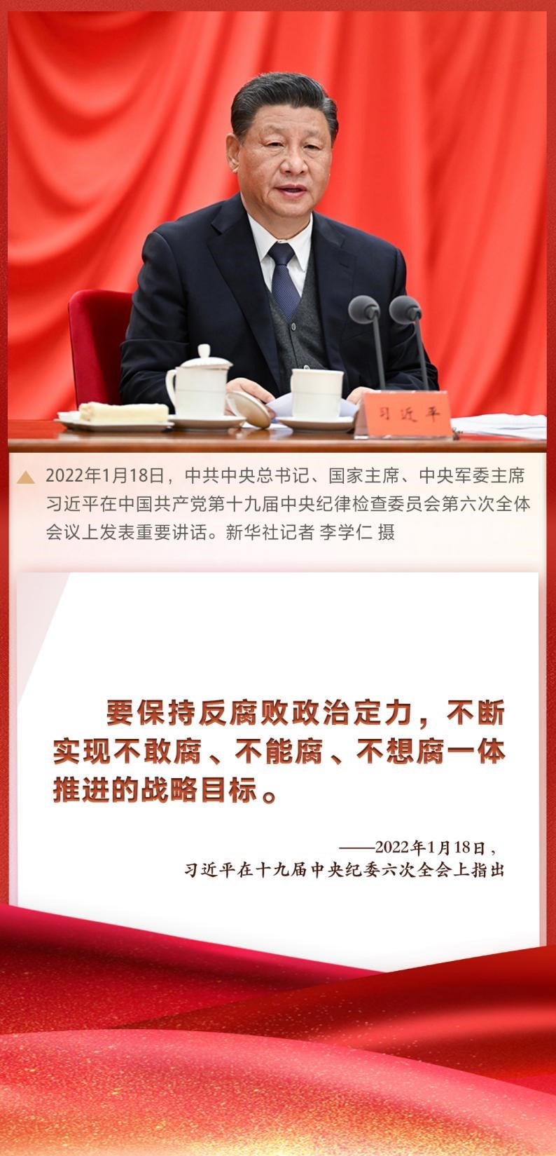 “要保持反腐敗政治定力,不斷實(shí)現(xiàn)不敢腐、不能腐、不想腐一體推進(jìn)的戰(zhàn)略目標(biāo)?!敝泄仓醒肟倳?、國(guó)家主席、中央軍委主席習(xí)近平在十九屆中央紀(jì)委六次全會(huì)上發(fā)表重要講話,深刻總結(jié)新時(shí)代黨的自我革命的成功實(shí)踐,深刻闡述全面從嚴(yán)治黨取得的歷史性、開創(chuàng)性成就,產(chǎn)生的全方位、深層次影響,對(duì)堅(jiān)持不懈把全面從嚴(yán)治黨向縱深推進(jìn)、迎接黨的二十大勝利召開作出戰(zhàn)略部署。