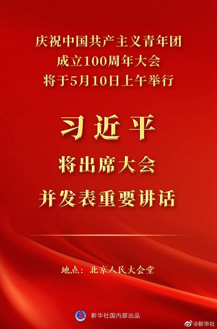 新華社北京5月8日電慶祝中國共產(chǎn)主義青年團成立100周年大會將于5月10日上午在北京人民大會堂隆重舉行。中共中央總書記、國家主席、中央軍委主席習近平將出席大會并發(fā)表重要講話。