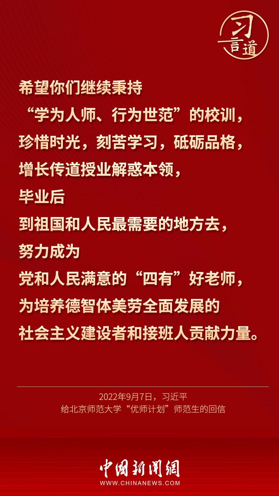 9月7日,習(xí)近平總書記回信勉勵北京師范大學(xué)“優(yōu)師計劃”師范生,努力成為黨和人民滿意的“四有”好老師。十八大以來,習(xí)近平多次通過書信的形式,對教師群體寄予殷切期望。