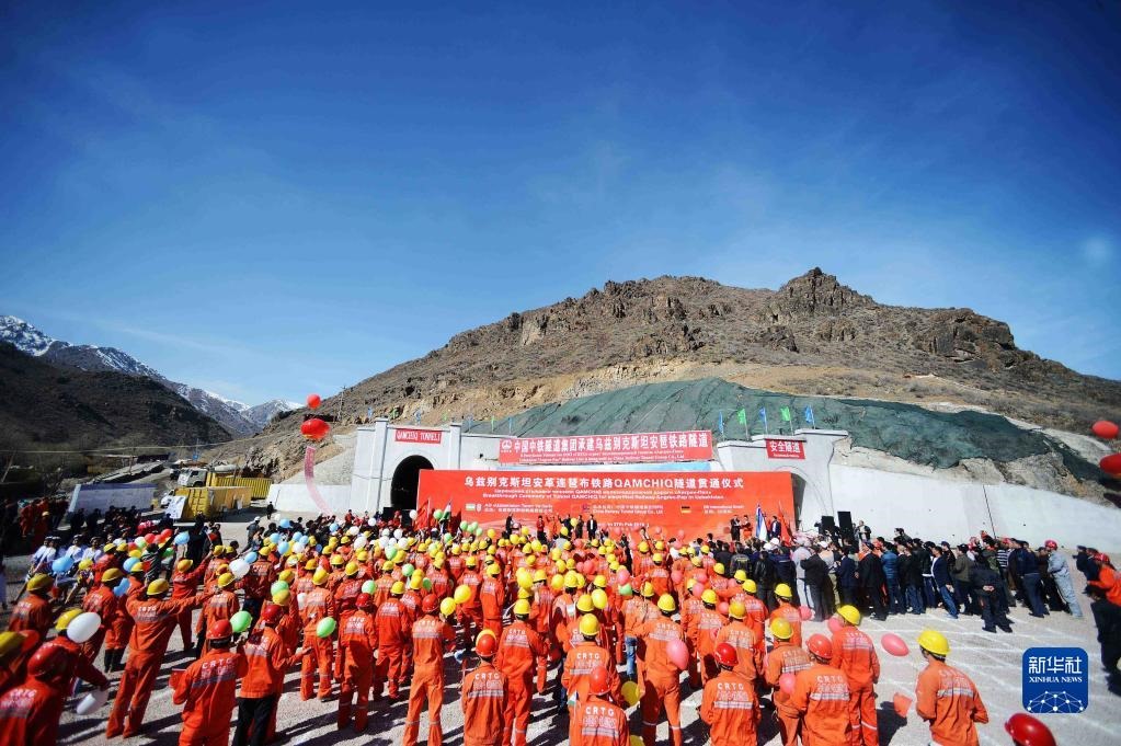 這是2016年2月27日在烏茲別克斯坦“安格連-帕普”鐵路卡姆奇克隧道出口拍攝的全隧貫通儀式現(xiàn)場。新華社記者 沙達提 攝