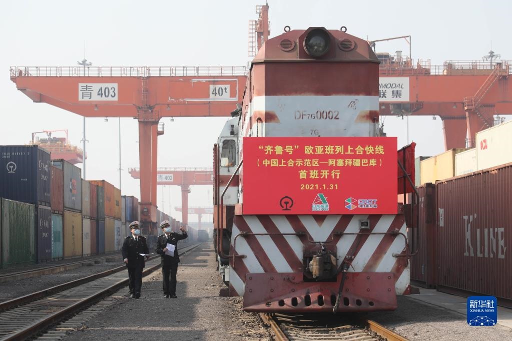 膠州海關關員對“齊魯號”歐亞班列上合快線(中國上合示范區(qū)——阿塞拜疆巴庫)線路首班列車進行檢查(2021年1月31日攝)。新華社發(fā)(解豪攝)