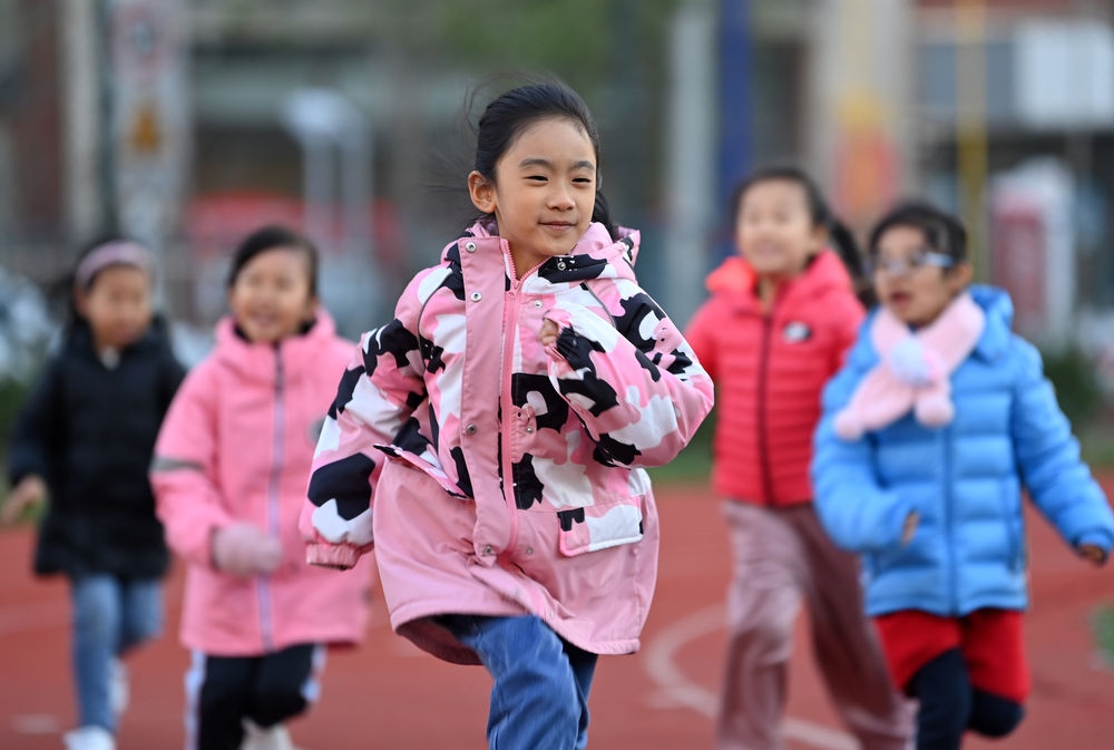 在天津市河西區(qū)德賢小學(xué),學(xué)生在課后素質(zhì)拓展課上跑步鍛煉(2021年11月11日攝)。