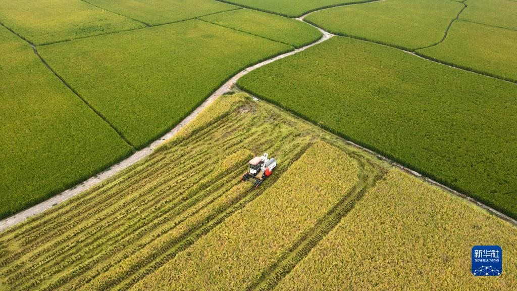 2022年9月28日,合肥市肥西縣花崗鎮(zhèn)河豐社區(qū)村民駕駛收割機收獲中稻(無人機照片)。新華社發(fā)(徐勇攝)