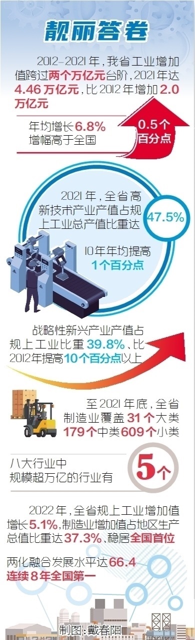 制造業(yè)規(guī)模實力保持領(lǐng)先。我省把制造業(yè)高質(zhì)量發(fā)展擺在更加突出位置,加快傳統(tǒng)產(chǎn)業(yè)轉(zhuǎn)型和戰(zhàn)略性新興產(chǎn)業(yè)發(fā)展,推進(jìn)產(chǎn)業(yè)邁向中高端水平。工業(yè)增加值10年跨過3萬億、4萬億兩個臺階,2021年達(dá)4.46萬億元,比2012年增加2.0萬億元,年均增長6.8%,增幅高于全國0.5個百分點。