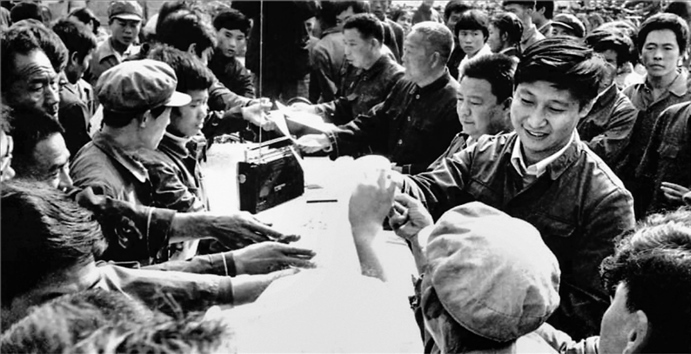 △1984年10月,習(xí)近平在正定縣城街頭發(fā)放民意調(diào)查表。