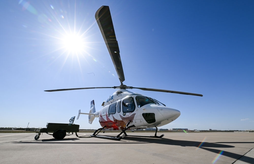 這是2023年4月7日在航空工業(yè)天津直升機(jī)有限責(zé)任公司停機(jī)坪拍攝的“吉祥鳥”AC332直升機(jī)。新華社記者 孫凡越 攝