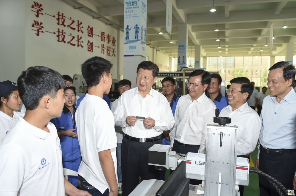2015年6月17日,習(xí)近平在貴州省機(jī)械工業(yè)學(xué)校實(shí)訓(xùn)基地勉勵學(xué)生加強(qiáng)操作訓(xùn)練、不斷取得優(yōu)異成績。