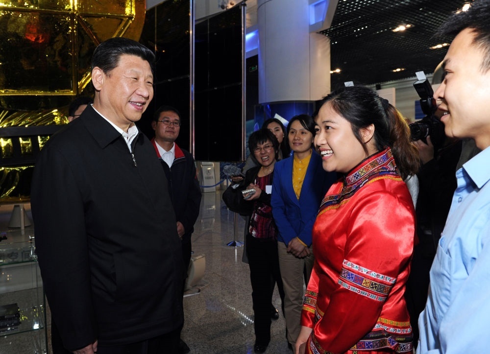 2013年5月4日,習(xí)近平來到中國航天科技集團(tuán)公司中國空間技術(shù)研究院,同各界優(yōu)秀青年代表座談并發(fā)表重要講話。這是座談會前,習(xí)近平和在展廳參觀的優(yōu)秀青年代表交談。