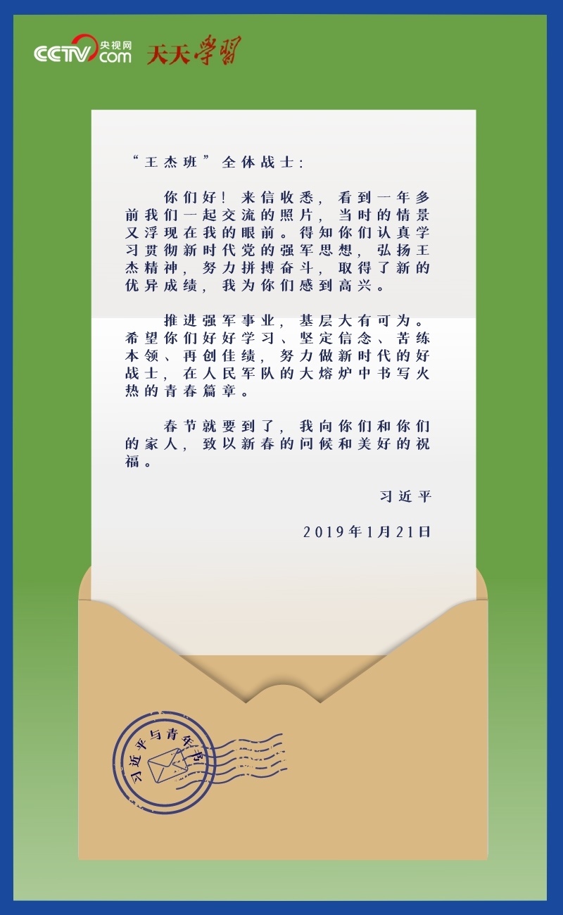 當(dāng)收到來自中南海的回信,“王杰班”的戰(zhàn)士們個個難掩激動。習(xí)主席在信中殷殷勉勵大家“努力做新時代的好戰(zhàn)士,在人民軍隊的大熔爐中書寫火熱的青春篇章”。