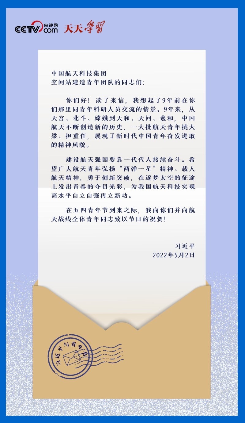 2022年5月2日,在五四青年節(jié)到來之際,中國航天科技集團空間站建造青年團隊收到了一份特別的節(jié)日禮物——一封落款為“習(xí)近平”的回信。