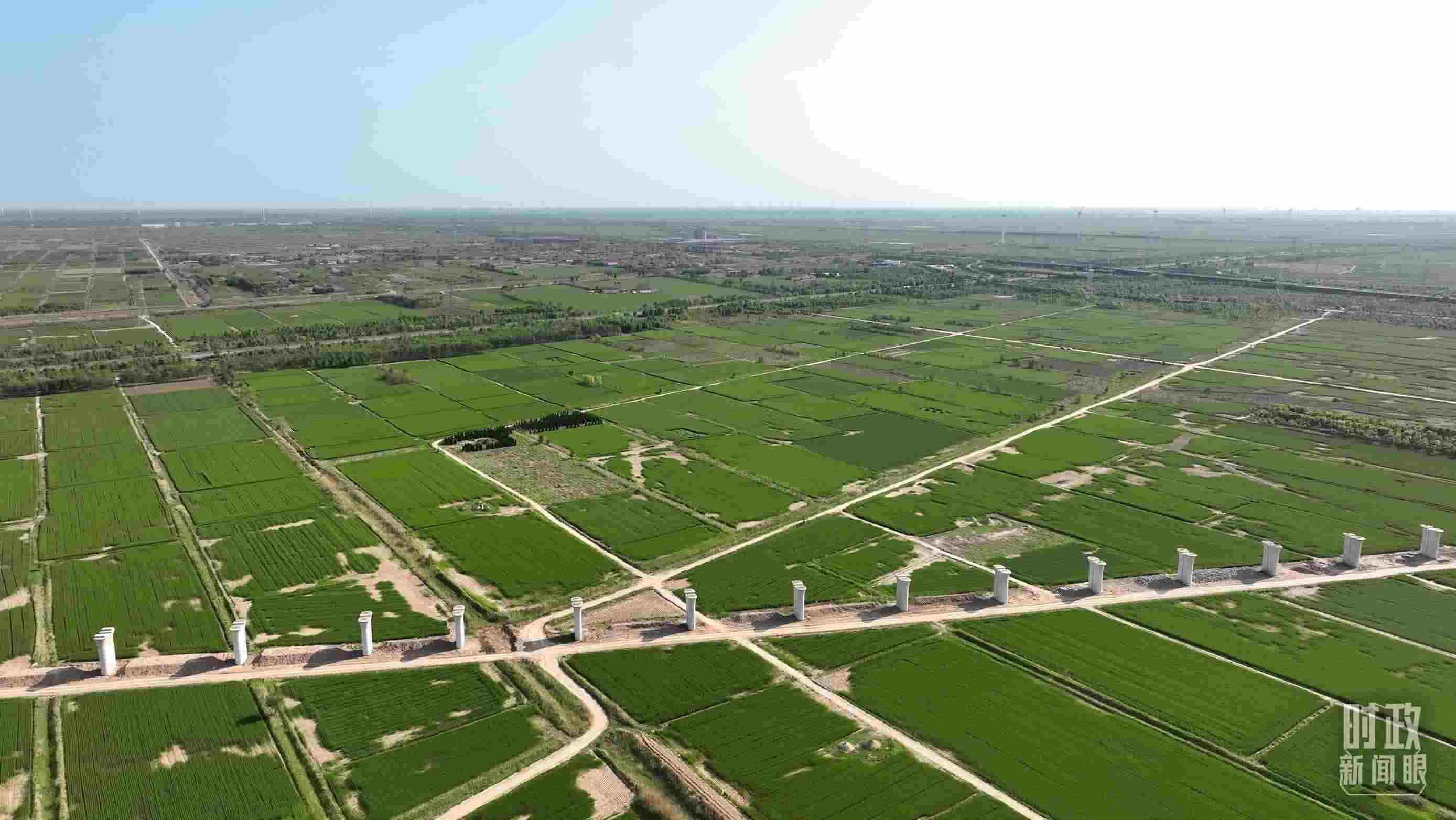 △旱堿麥田被分割成整齊劃一的綠色方塊。(總臺(tái)記者郭永良拍攝)
