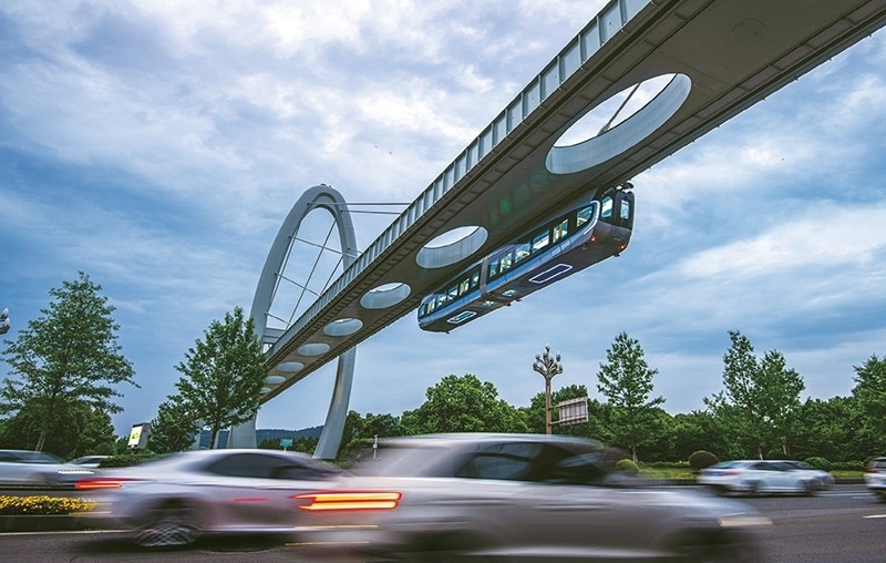 列車懸掛在軌道下方,從人們頭頂飛馳而過,這樣的科幻場景,最近在武漢東湖新技術(shù)開發(fā)區(qū)成了現(xiàn)實。圖為2023年5月9日,武漢“光谷光子號”空軌列車在綜合聯(lián)調(diào)和試運行中。 新華社記者 肖藝九/攝