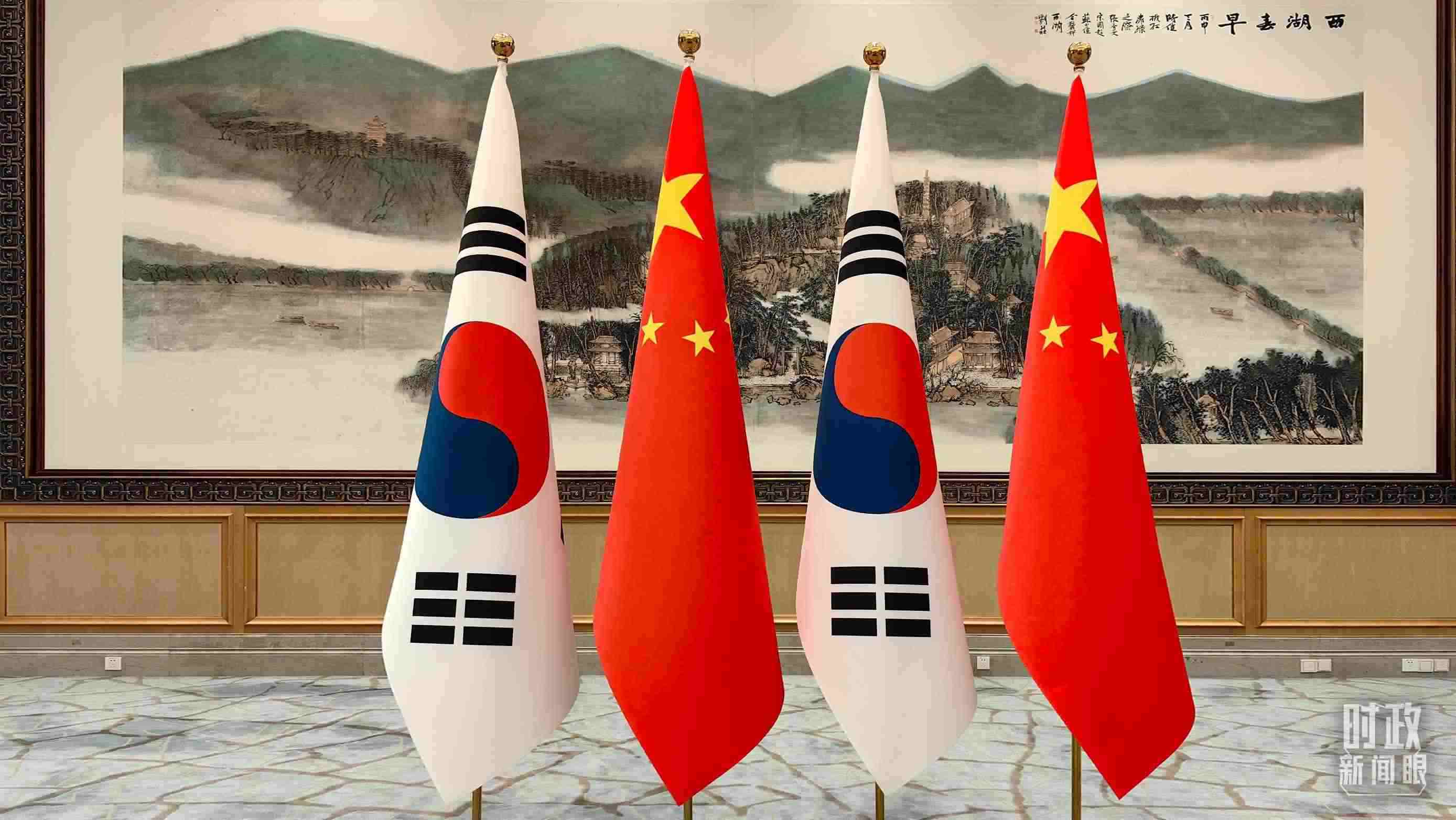 △會(huì)見現(xiàn)場擺放的中國、韓國國旗。(總臺(tái)央廣記者潘毅拍攝)