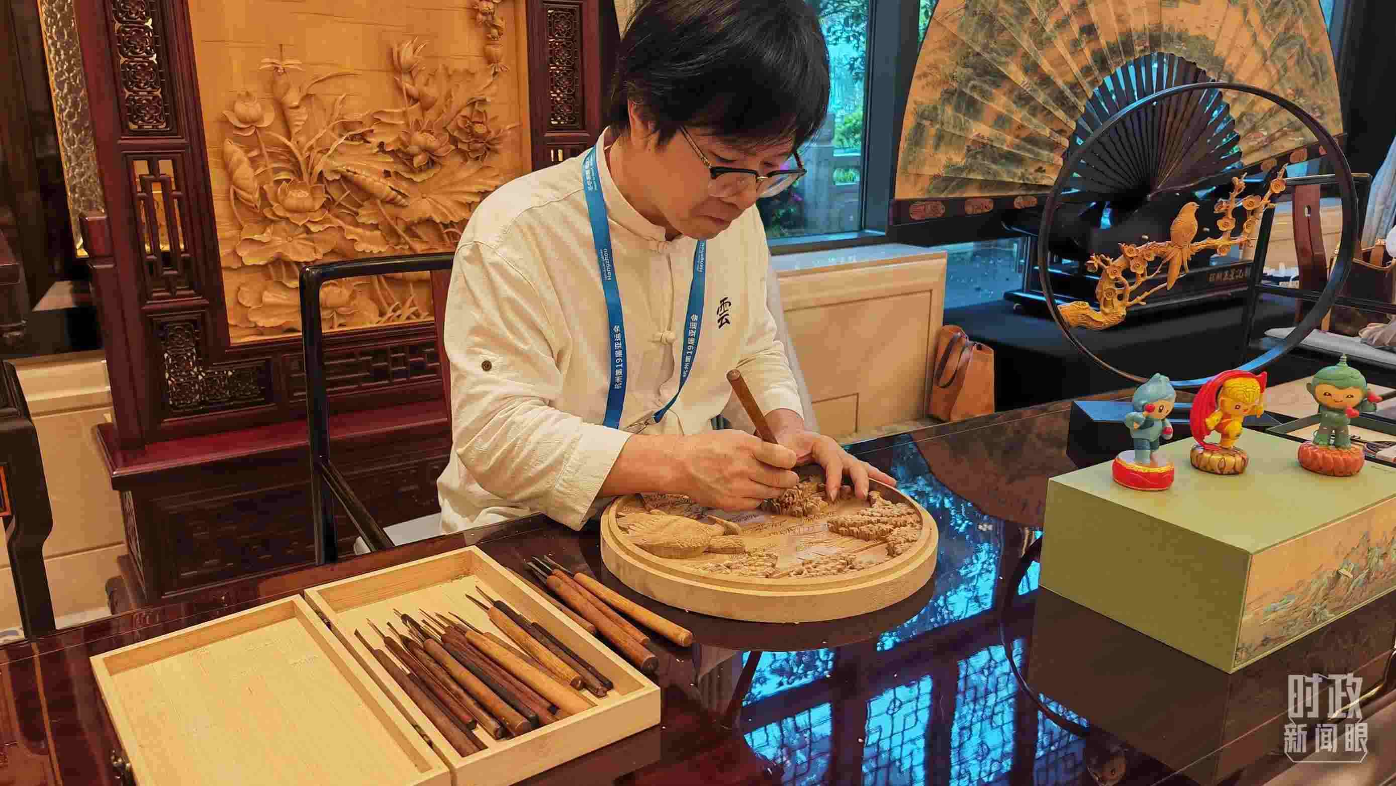 宴會(huì)廳外,東陽木雕、杭州刺繡、王星記扇等浙江非物質(zhì)文化遺產(chǎn)展示,吸引貴賓們流連駐足。